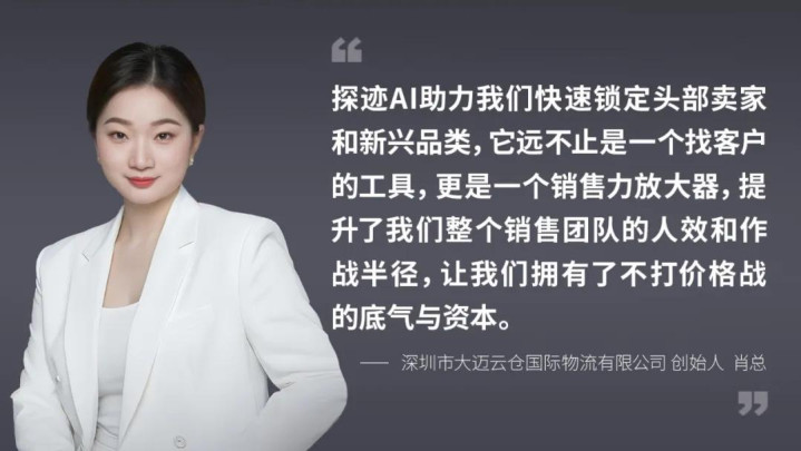 “过去客户为争夺库位甘愿溢价数倍的热情早已消退,更为苛刻的价格谈判成了常态。”深圳市大迈云仓国际物流有限公司创始人肖总回忆道。这位来自湖南的年轻妹子从借驻跨境论坛的小办公室起步,在行业最卷的时候,用探迹AI重构了销售漏斗,对TikTok、Temu、独立站等优质卖家的精准出击,如今拥有国内外120人团队、9个海外仓库,实现了6倍增长、营收突破2亿的业绩,一起来看看她是如何做到的。