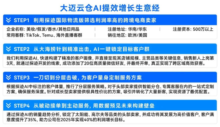 探迹AI成了大迈云仓的新人杀手级培训工具。“新人培训第一课就是如何用这个AI工具找客户、怎么背调客户信息,很多新人上岗第三天就能通过它开发出意向客户。”