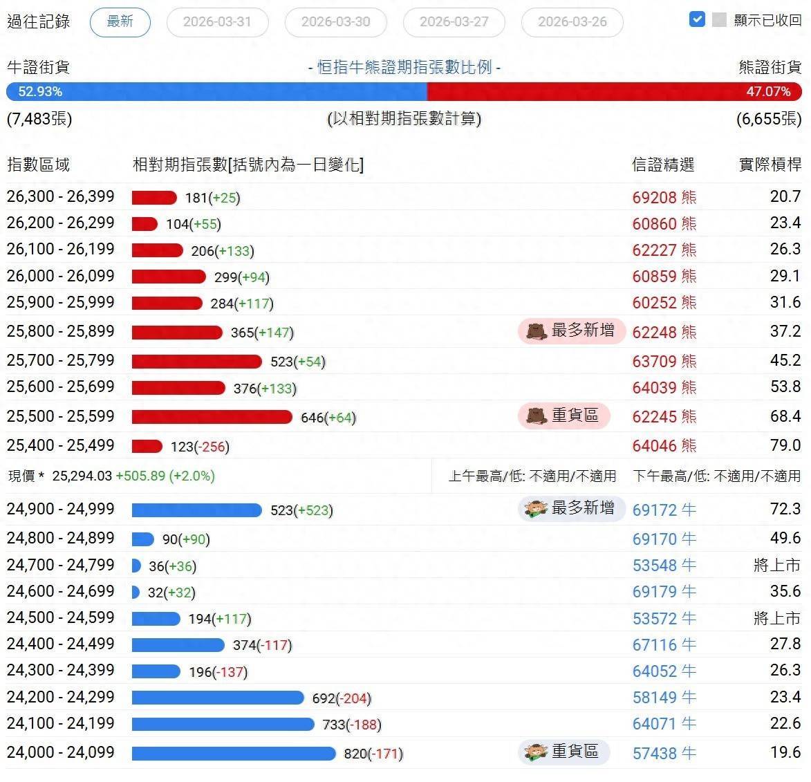 牛证街货重货区在24000-24099区间,该区间最新牛证数量为820张,较上一交易日减少171张;最多新增在24900-24999区间,该区间最新牛证数量为523张,较上一交易日增加523张。