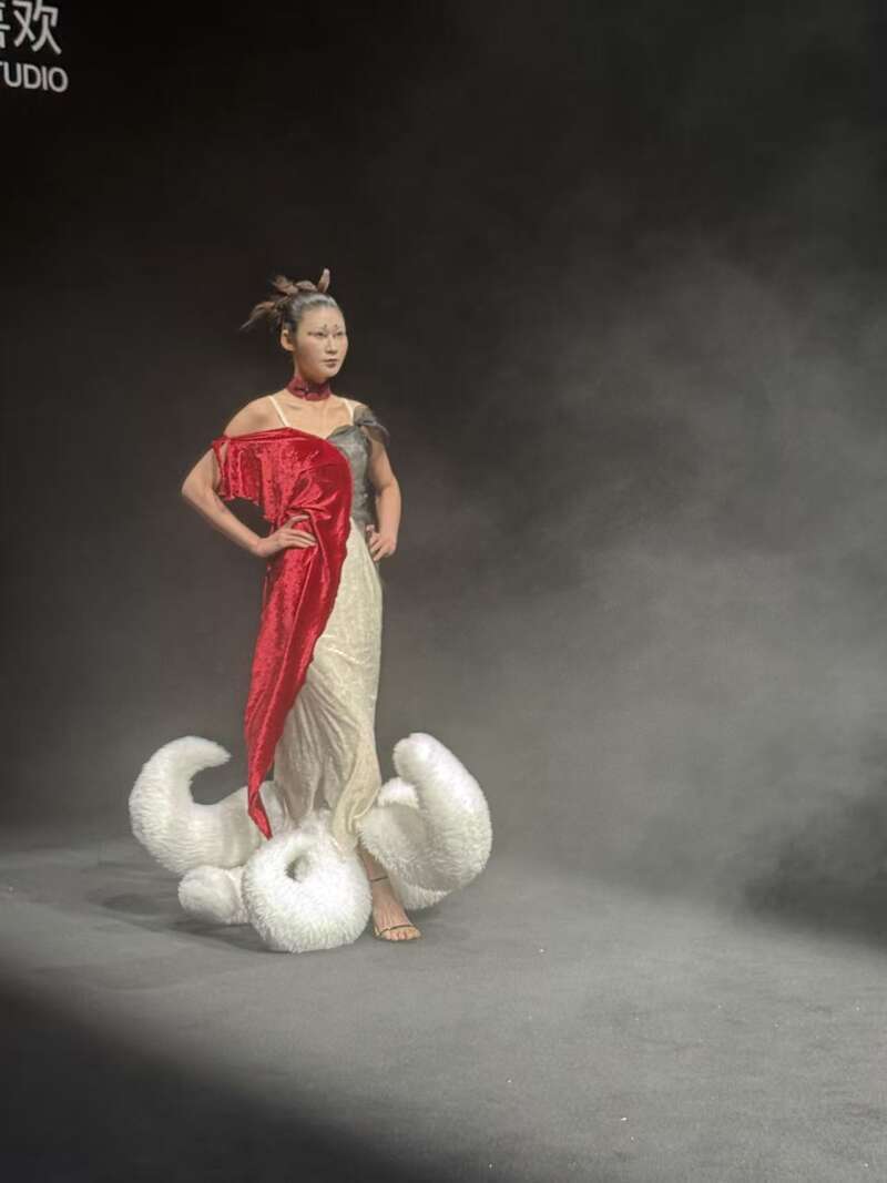 秀场上,一组以《山海经》元素为主题的设计尤为引人注目。小设计师们以现代视觉语言重译上古神话,将“九尾狐”“青耕”“烛龙”等形象融入服装设计,用色彩碰撞与夸张廓形重构神兽。