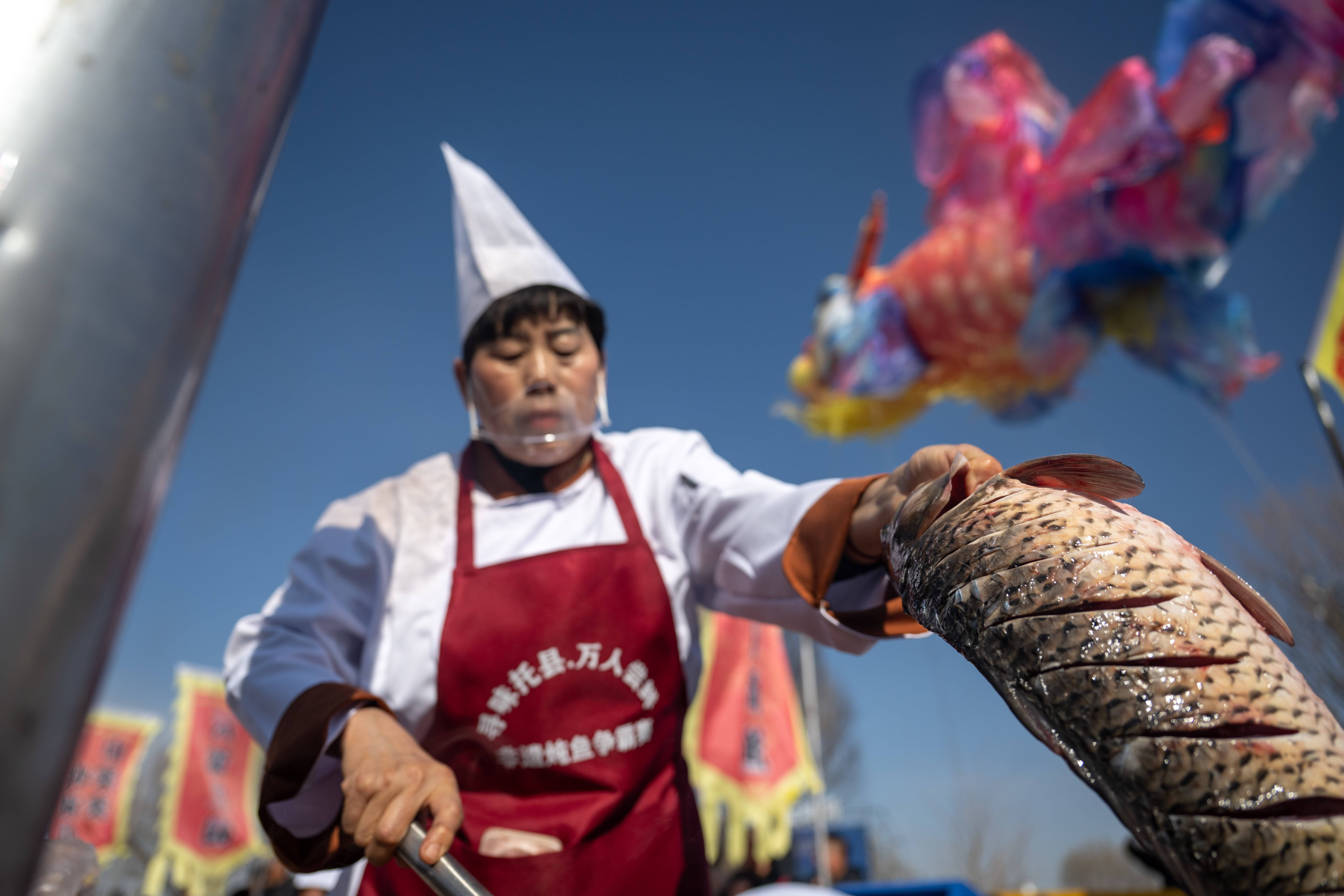 3月20日,厨师们在呼和浩特黄河开河民俗文化周活动现场炖鱼。新华社记者 连振 摄当地还打造神泉山庄,推动黄河鱼品牌化运营,同步发展葡萄种植、采摘体验、庭院休闲等多元业态。“吃鱼、观景、体验、度假”形成完整链条,让小渔村变身成为远近闻名的文旅打卡地。